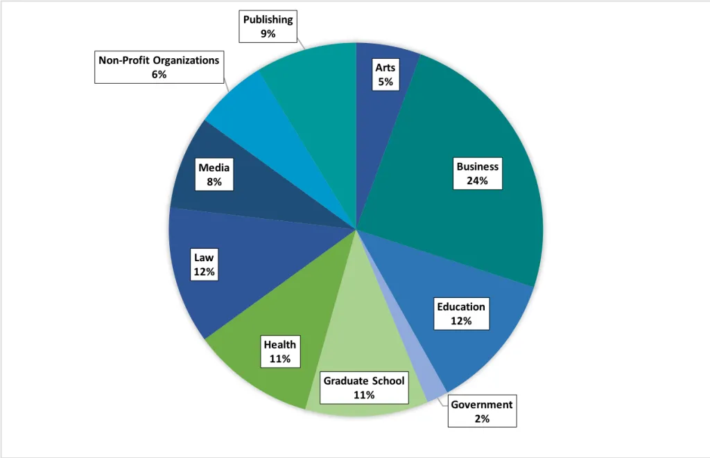 This pie chart, drawn from the Washington University English Alumni Directory, displays the schools and industries chosen by our recent graduates. Approximately one quarter went on to law or medical school; one quarter work in education or pursue advanced degrees in the humanities; one quarter are occupied in media, publishing, or various non-profit organizations; and one quarter have found careers in general business.